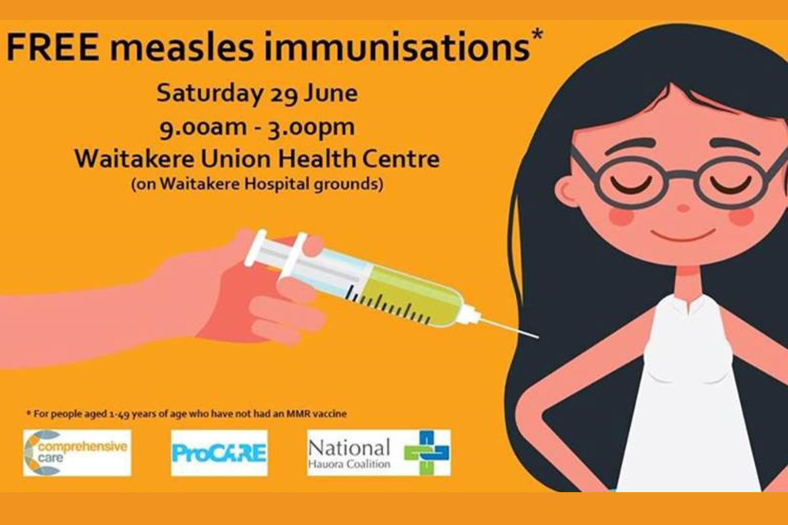 There is a measles outbreak in Auckland, with more than 126 confirmed cases this year. Don’t be a victim of this highly infectious illness which can be very serious. If you or anyone in your whanau is aged between 1 – 49 years and has not had one MMR vaccination, come get one FREE.